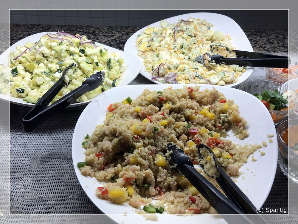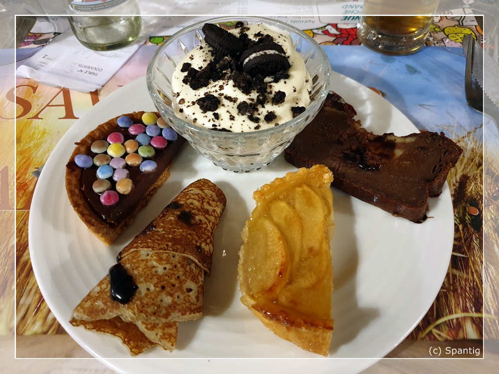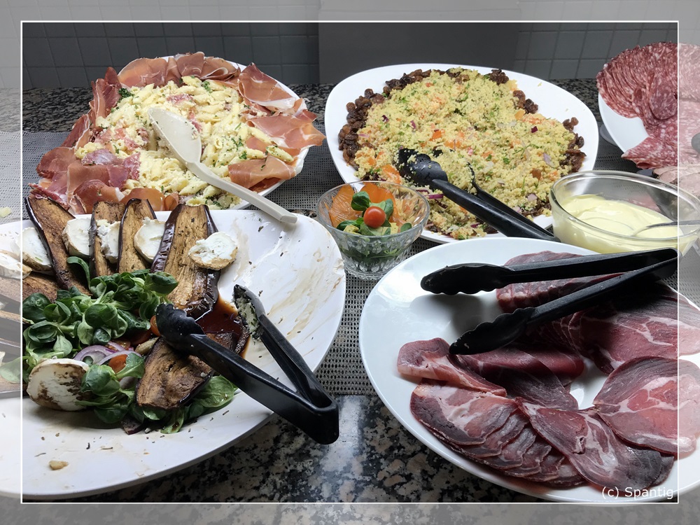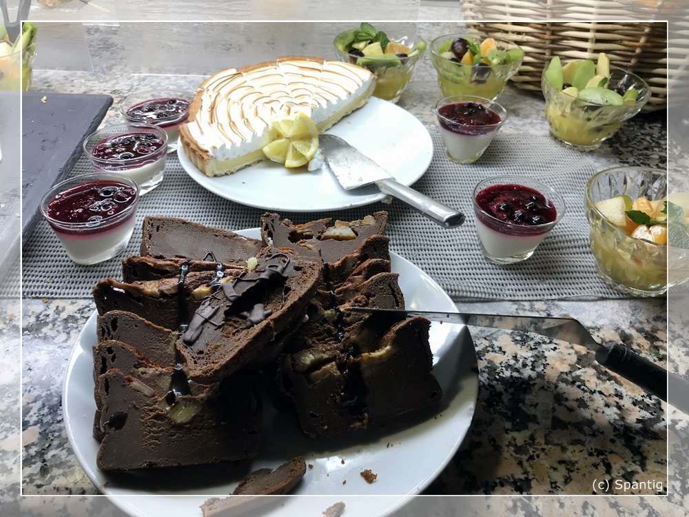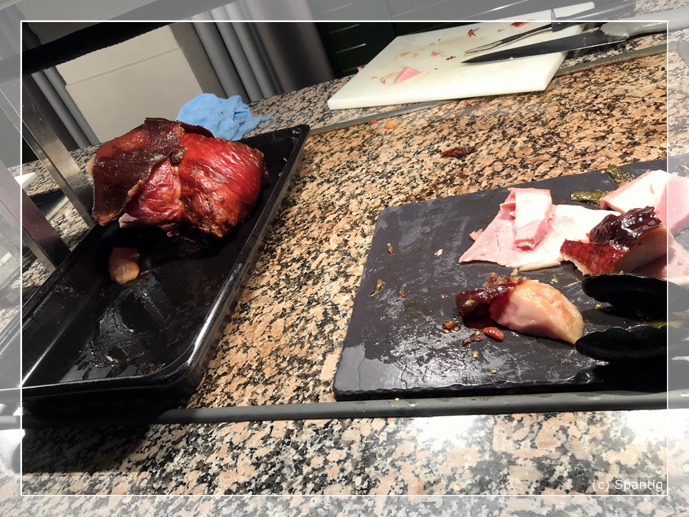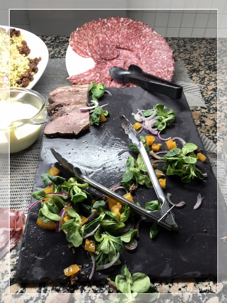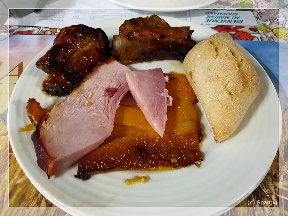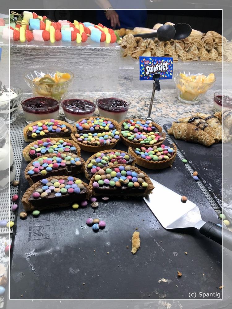 Das Buffet kostet 22,00€ für Erwachsene und 10,00€ für Kinder. Es ist recht reichhaltig und von guter Qualität. Die Getränke, die extra berechnet werden sind dagegen auf „Disney-Niveau“. So kostet eine 0,33l Flasche Cider oder Desperados je 6,00€. Ich hatte beim Checkin gefragt ob man für das Buffet am Abend reservieren muss. Dies wurde verneint und wir bekamen einen Gutschein über 15% dafür. Einziger Mangel war die Atmosphäre dort. Es war wie in einer Bahnhofshalle, recht laut und ungemütlich.