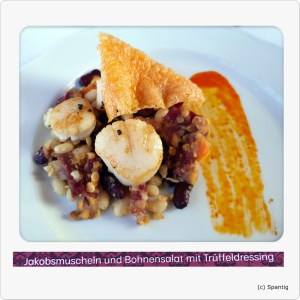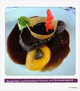 Siggi hatte als Vorspeise „Dreierlei von der Ente“ als Hauptgericht das mit Pesto gefüllte Lendenstück von Kalb und als Dessert Aschenputtels Nachspeise. Ich hatte als Vorspeise Jakobsmuscheln auf Bohnensalat, als Hauptgericht Rinderfilet mit Rotweinsauce und zum Schluss das Prinzessinendessert.