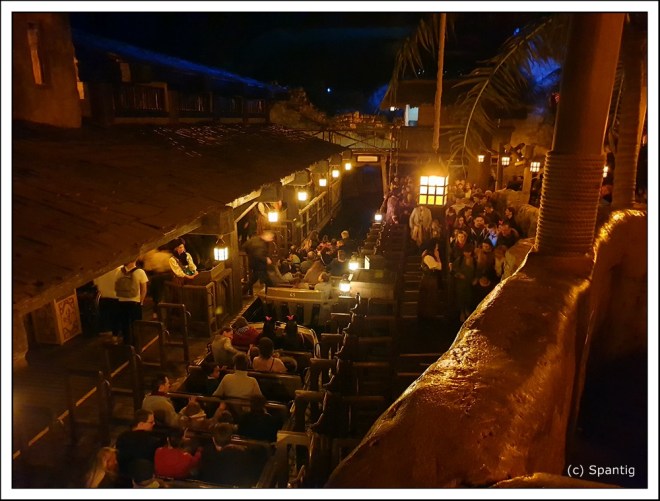Vorbei an Captain Jacks Restaurant beginnt die Fahrt, die an dem Kerker in der Festung, dem Dorf das von Piraten geplündert wird und zum Schluss an Captain Jack selber auf seinem Goldschatz vorbei führt. Die Fahrt ist die Vorlage für die Filmreihe. Ähnliche Fahrten gibt es in jedem Disney Park weltweit.